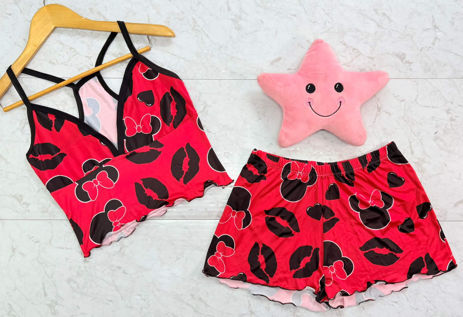 La blusa como el short están confeccionados en suave tela de licra poliéster, ofreciendo un ajuste elástico y confortable para tus noches de descanso.